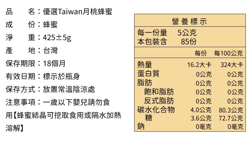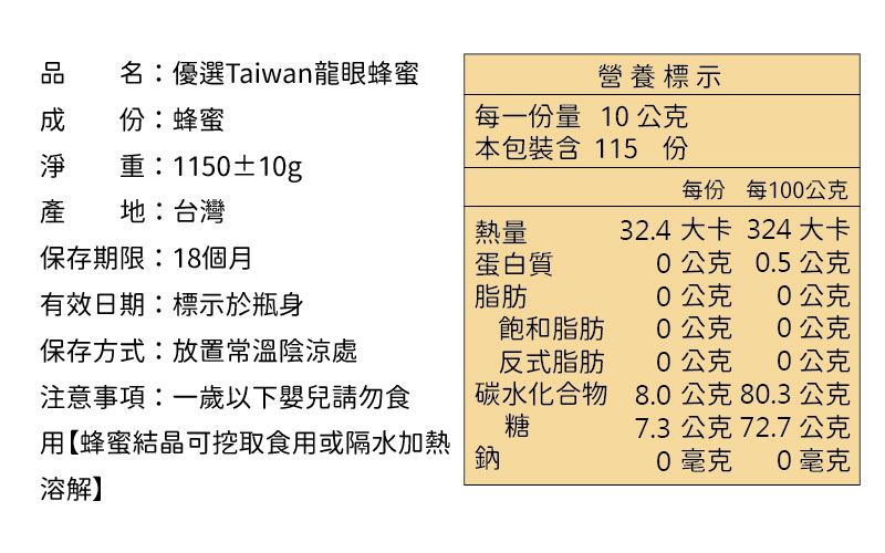 養蜂人家優選Taiwan蜂蜜,尋找台灣最佳龍眼樹產地,採集全期最優良品質,推出媲美比賽等級的頂級龍眼蜂蜜,再以最嚴格的品質控管流程,精挑細選之下每一滴蜂蜜不僅質純,更是色,香,味,美俱全。顧客喜愛度NO1,從小喝到大的台灣滋味,來自優良農場,品質上等,口感香醇濃郁。