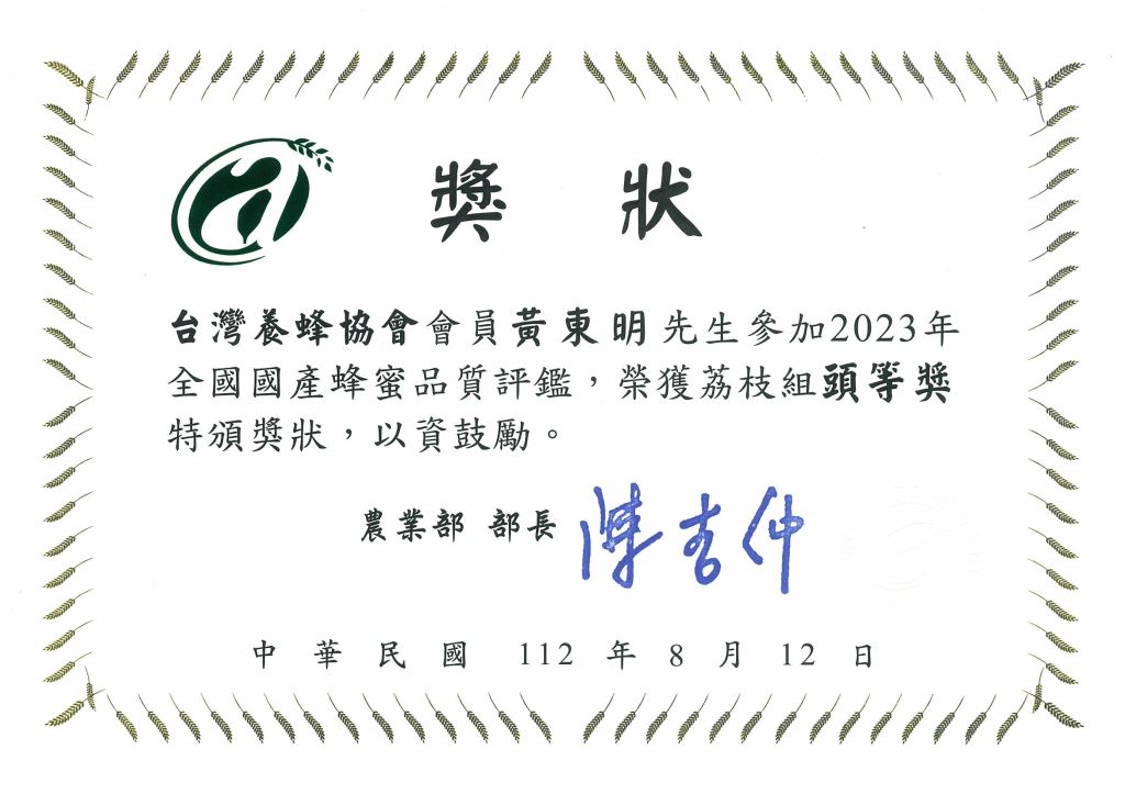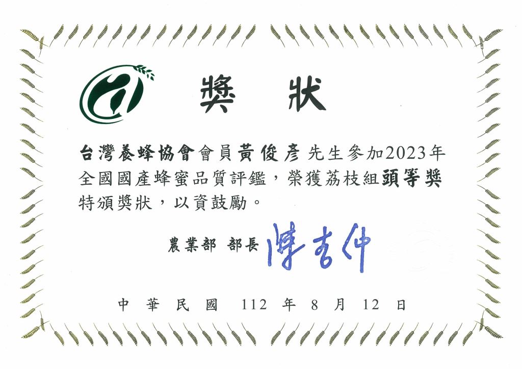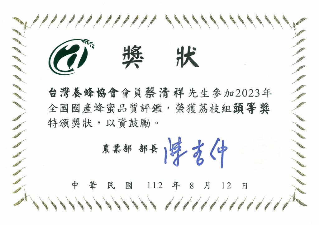 頭等獎由行政院農委會所推動的農產品驗證制度,養蜂人家率先於2020年首批申請蜂蜜產銷履歷,申請過程繁瑣,蜂蜜必須為台灣本產,從蜂場管理,蜂群紀錄,採收,儲存,分裝,檢驗等流程都必須符合產銷履歷的嚴格法規和要求。