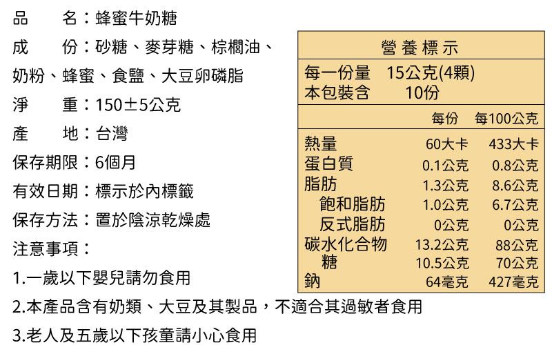 - 本產品含蜂蜜,一歲以下兒童不建議食用