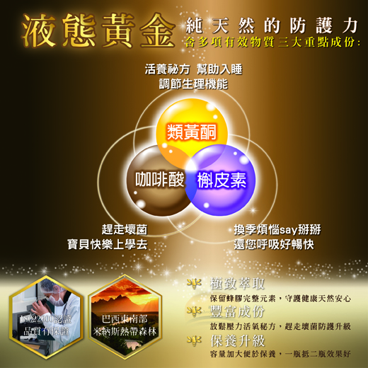 高濃度蜂膠萃取液+頂級蜂蜜+足量維他命C,黃金比例打造全台唯一獨家販售。革命新口感,便利新突破。