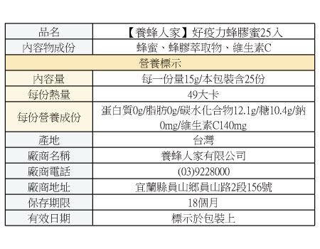 商品注意事項一歲以下兒童不宜食用商品若有顆粒或固態狀時,為蜂蜜自然結晶狀態,食用前可以手溫稍微搓揉外包裝即可,不影響品質,請安心食用。極少數體質過敏者,食用後有皮膚些微紅腫與灼熱等現象,應即減量或停止食用。