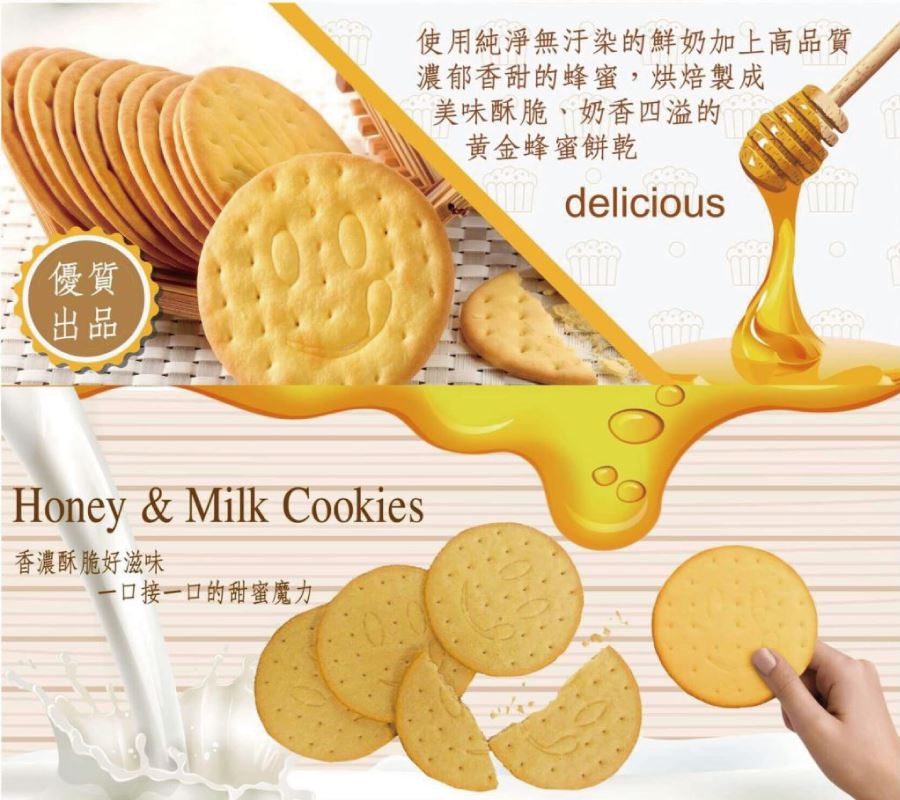 使用純淨無污染的鮮奶加上高品質濃郁香甜的蜂蜜,烘培製成美味酥脆,奶香四溢的黃金蜂蜜餅乾。口感香濃酥脆,讓您一口接一口的甜蜜魔力愛不釋手。