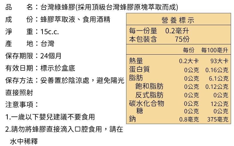 產地:蜂膠原塊(台灣);生產萃取(台灣)